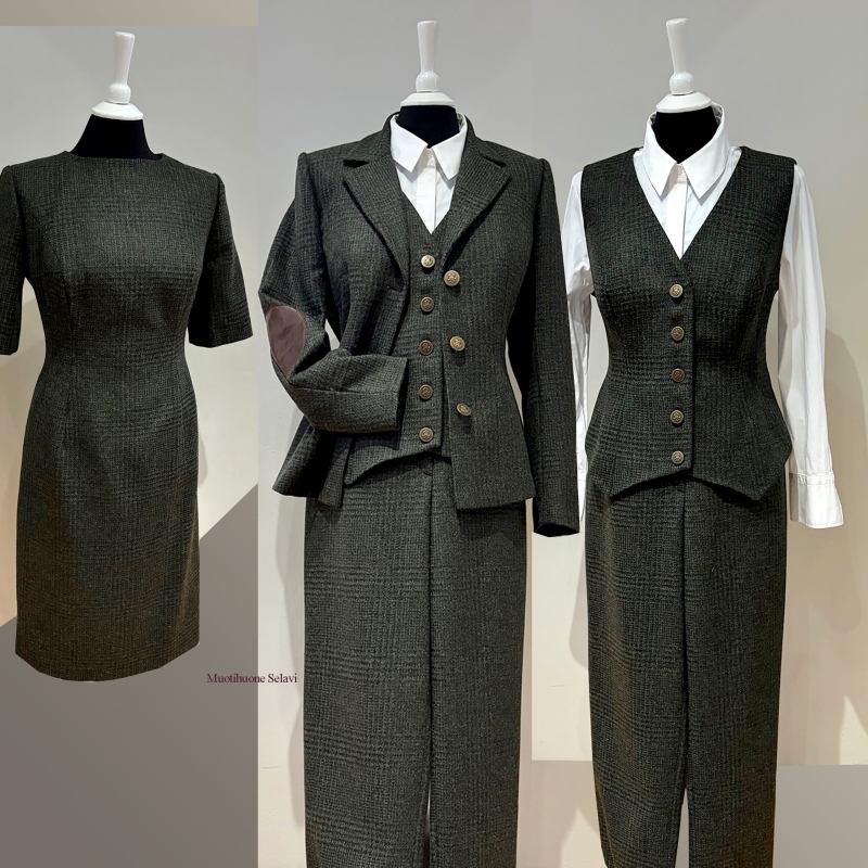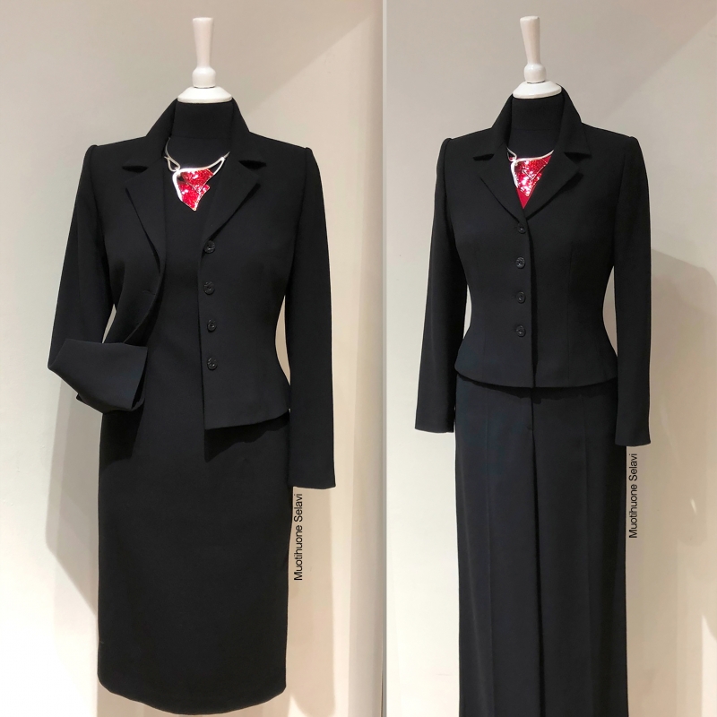 Kuvassa asiakkaan toiveiden mukaan ranskalaisesta chaneltyyppisestä kankaasta ja silkistä rakennettu upea asukokonaisuus: jakku, liivi, hame ja kotelopuku.