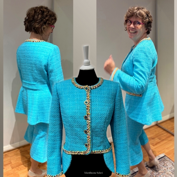 "Joraava", kerrassan hurmaava leidi toivoi värejä, värejä, värejä ja lika som Abba -style housuihin. Jakussakin erilaisia ulottuvuuksia edessä ja takana - taskuja ja nauhoja myöten! Kaikki materiaalit ovat Ranskasta.