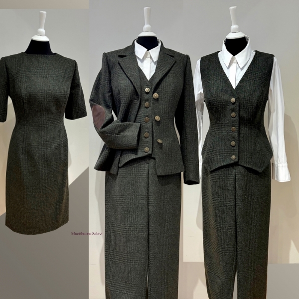 Mainio asiakkaamme oli etsinyt pitkään kuvassa näkyvää nahkasomisteista pukukokonaisuutta. Kunnes hän löysi Muotihuone Selavin. 100% villakokonaisuus on valmistunut asiakkaan kankaasta. Kuvasta puuttuu vielä hame. Tällä klassisella asucombolla pärjää vuodesta toiseen.